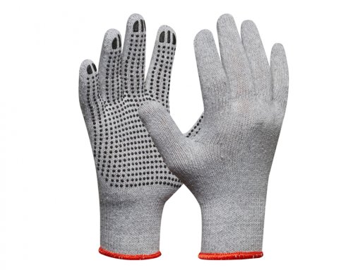 Pracovní rukavice v bezešvém, lehkém provedení. Pohodlně se nosí. Jejich výstupky z PVC zajišťují bezpečné uchopení i na hladkých předmětech a zajišťují delší trvanlivost. Chrání před nečistotami a vlhkostí. Využití je univerzální a to od montáže, po práci ve skladu. Materiál: polyester, bavlna, PVC. Velikost: 9. Barva: šedá.