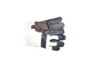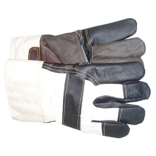 Zimní kombinované rukavice, dlaň z různobarevné lícové nábytkové hověziny, hřbet a manžeta z bílé bavlněné tkaniny, zateplená podšívka.