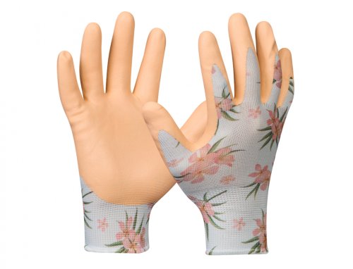 Pracovní rukavice s potiskem oleandrů. Na jejich výrobu bylo použito recyklovaných PET lahví. Vyrobeny z pohodlného, pružného a prodyšného úpletu z polyesterových nití opatřené speciálním nitrilovým pěnovým povlakem. Účinně odpuzují olej a vodu. Velikost: 8. Barva: oranžová.