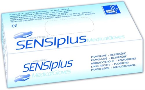 Vyšetřovací rukavice DONA SENSI PLUS - nesterilní, bezprašná. Tato rukavice je navržena pro pohodlné a bezpečné nošení. Velmi nízký obsah proteinů a antigenů v této rukavici dovoluje pohodlné a bezpečné používání rukavice. Alergické reakce jsou minimalizovány díky zvláštnímu procesu máčení a vylučování během kterého se odstraňuje (extrahuje) maximum dráždivých látek z rukavice. Tato rukavice je vyrobeny z přírodního latexu, který může způsobovat alergické reakce i přes maximální redukci obsahu proteinů na velmi nízkou úroveň. Bezpečné použití citlivými jedinci nebylo stanoveno.