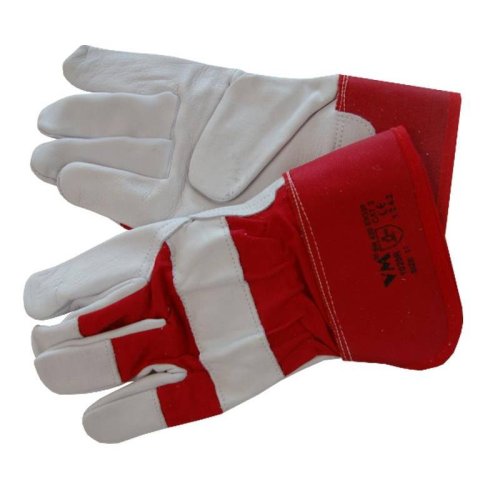pracovní rukavice kombinované VM 1020 R dlaň z velmi silné a pevné hovězinové usně v bílé barvě hřbet z bavlněné červené tkaniny tuhá pogumovaná manžeta bez podšívky použití: proti mechanickým rizikům …