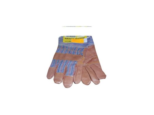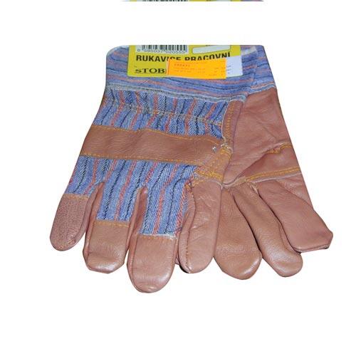 Kombinované rukavice, dlaň z různobarevné lícové nábytkové hověziny, hřbet a manžeta z pruhované bavlněné tkaniny, podšívka ve dlani.