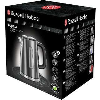 Rychlovarná konvice RUSSELL HOBBS 23211-70 Luna Moonlight Grey z nerezové oceli disponující objemem 1,7 l a příkonem 2 400 W přinese unikátní šarm do vaší kuchyně. 360° kruhová základna umožňuje uložit konvici v jakémkoliv úhlu. Zdokonalená nálevka zajišťuje vždy perfektní nalévání, bez nežádoucího cákání vody kolem konvice. Skryté topné těleso je chráněno před vodním kamenem, čímž je prodloužena jeho životnost. Vnitřek konvice se dá spolu s odnímatelným a omyvatelným filtrem jednoduše vyčistit