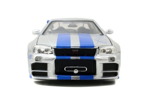 Kovový model auta z filmu Rychle a zběsile - GTR-R R34 na volnoběh v měřítku 1:24, otevírací dveře, kufr a kapota, délka 19 cm.