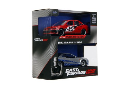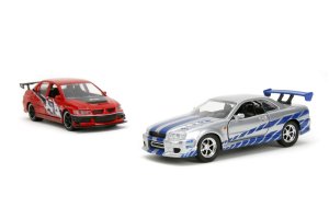 Kovové modely aut z filmu Rychle a zběsile 2006 Mitsubishi Lancer Evo IX a Brianův 2002 Nissan Skyline GTR R34 v měřítku 1:32, otevírací části, volnoběh, vícebarevné. Velikost 13 cm. Wave 4/2.
