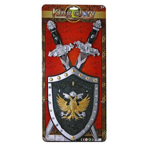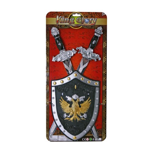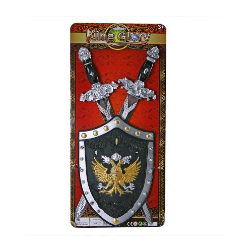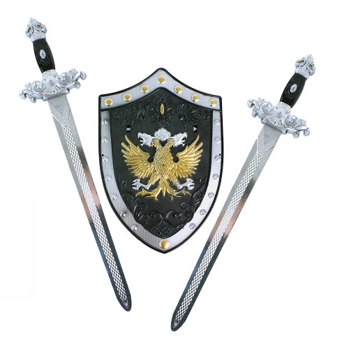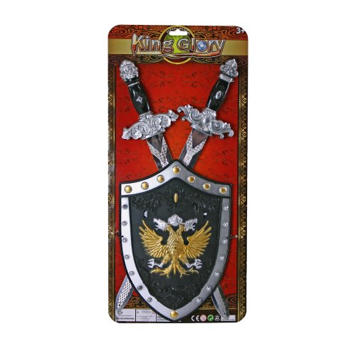 Nasaď si štít na ruku, uchop meč a hurá do rytířského boje! Set obsahuje 2 stříbrné meče v délce 49 cm a jeden zdobený štít s erbem.