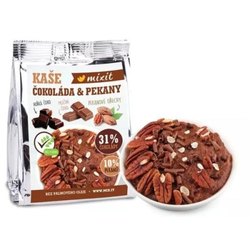 Rýžová kaše Mixit zdobená pecičkami hořké čokolády doplněnými o hoblinky mléčné čokolády, které si skvěle rozumí s křupavými pekanovými ořechy V každé porci získáte navíc vydatnou porci energie z rýžových …