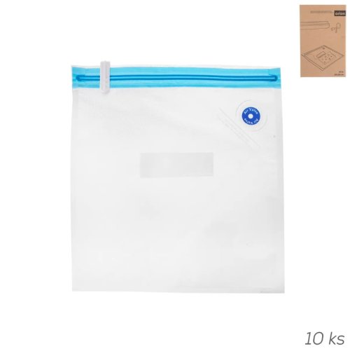 Uzavíratelné vakuovací sáčky do vakuovaček potravin se zipovým uzávěrem a vzduchotěsným odsávacím ventilem. Sáčky jsou vyrobeny ze speciální odolné fólie, kterou lze umývat a opakovatelně používat. Uloží potraviny v lednici, v mrazáku i v potravinové skříňce. Potraviny v nich vydrží až 5x déle čerstvé než v běžných sáčcích. Jedna strana transparentní, druhá má speciální vroubky pro snadné a rychlé vakuování. Barevný štítek umožňuje zapsání data uchování nebo vyznačení druhu potravin. Sada 10 ks. Součástí jsou 2 plastové jezdce pro snadnější uzavírání. Použití od -20 °C do +110 °C. Plňte pouze po vyznačenou rysku. Neobsahuje BPA. Materiál nylon (PA)-PE. Rozměry 26 x 28 cm (+/- 0.5 cm). EAN 8592381233396