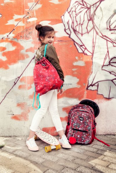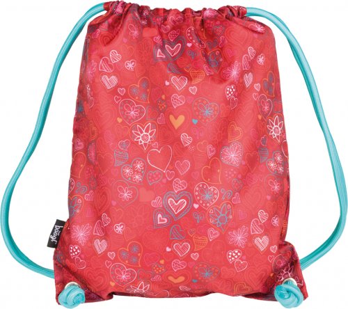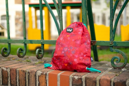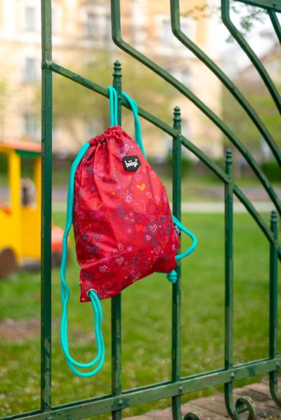 • Sáček na cvičky nebo přezůvky s motivem srdcí z pevného omyvatelného materiálu • Zdrhování pomocí pevných tkanic, které zároveň umožňují nošení na zádech