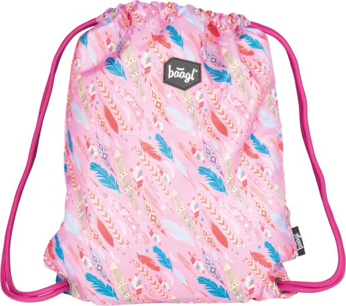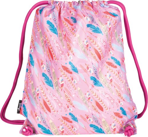 • Sáček na cvičky nebo přezůvky s motivem pírek z pevného omyvatelného materiálu • Zdrhování pomocí pevných tkanic, které zároveň umožňují nošení na zádech