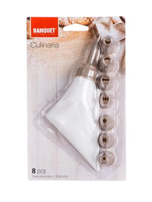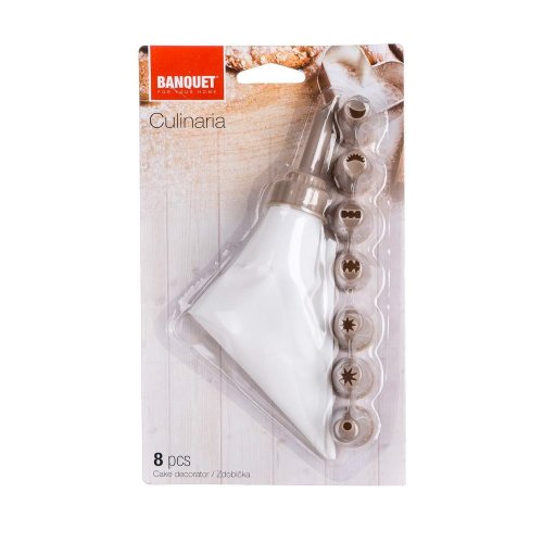 Zdobička CULINARIA je vynikající pomocník ke zdobení a plnění cukrářských i jiných pokrmů. Sada obsahuje 1 zdobící sáček a 8 různých druhů trysek, které vytvářejí různé druhy dekorů. Sada je vyrobena z odolného plastu a není vhodná do myčky na nádobí.