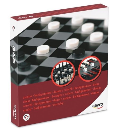 Objevte zábavu a strategii s naším magnetickým herním setem 3 v 1, který zahrnuje šachy, dámu a vrhcáby. Tento praktický herní set je ideální pro rodinné večery, přátelské soutěže nebo jako skvělý dárek pro milovníky deskových her a je ideální na cesty. Vhodné pro děti od 7 let věku. <br> <br> Obsah balení: <br> <br> herní plocha s integrovanými šuplíky <br> 15 bílých kamenů (dáma, vrhcáby) <br> 15 černých kamenů (dáma, vrhcáby) <br> 2 kostky (vrhcáby) <br> 32 herních figurek ve 2 barvách (šachy) <br> návod