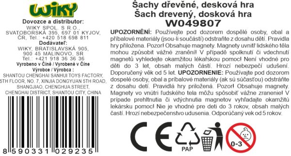 Šachy dřevěné. Velikost šachovnice 29cm. Šachovnice má magnetické zavírání i figurky. Každá figurka má zespodu filc pro tichý pohyb po šachovnici. Figurky lze uložit dovnitř do šachovnice.
