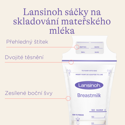 Lansinoh sáčky na uskladnění mateřského mléka byly vyrobeny speciálně pro mrazničky, ale mohou se používat i na uskladnění mateřského mléka v chladničce. Speciální výrobní proces umožňuje vyrábět tyto zdravotnické sáčky bez použití změkčovadel, a tak látky, které by mohly být škodlivé pro vaše dítě, nebudou vnikat do vašeho mateřského mléka.