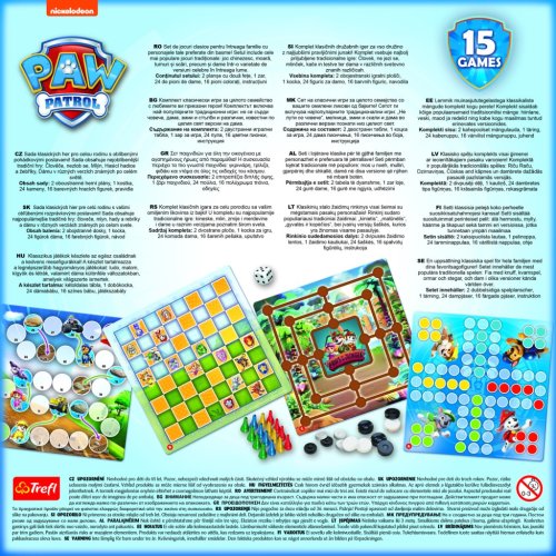 Set klasických her pro celou rodinu s oblíbenými pohádkovými postavami Tlapková patrola. Sada obsahuje tradiční hry: Člověče, nezlob se!, Mlýn Hadi a žebříky, Dámu a další hry známe po celém světě. Obsah balení: oboustranné herní plány, 1 kostka, 24 kamenů, 16 barevných hracích figurek, pravidla. Pro 2 - 4 hráče. Rozměry balení: 24 x 24 x 6 cm. Vhodné pro děti od 5 let.