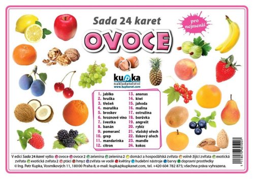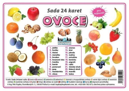 Univerzální sada fotografií pomůže předškolákům a malým školákům poznat základní druhy ovoce. Sada obsahuje 24 karet velikosti 10 x 7 cm (4 obrázky na kartě formátu A5 určené k rozstříhání). Tuto praktickou učební pomůcku využijí jak učitelé MŠ a 1. stupně ZŠ, tak rodiče se svými dětmi při hravém učení.