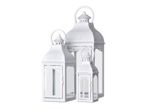 Sada tří luceren o rozměrech 100 × 250 mm, 140 × 355 mm a 190 × 480 mm v bílé kombinaci kovu a skla poskytuje bezpečné svícení a dekorativní efekt. Lucerny lze umístit na stůl, parapet nebo podlahu, samostatně nebo společně. Bílá barva dodává interiéru svěží a elegantní vzhled, vhodný pro moderní i klasický styl.