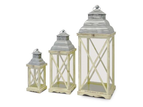 Sada tří luceren o rozměrech 140 × 410 mm, 220 × 580 mm a 290 × 790 mm v přírodní kombinaci dřeva a kovu je ideální pro stolní aranžmá, parapet nebo podlahu. Lucerny poskytují bezpečné svícení a vytvářejí hřejivou a útulnou atmosféru. Sada nabízí variabilní možnosti umístění a dekorativního efektu, vhodná pro moderní i rustikální interiéry.