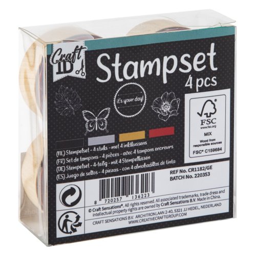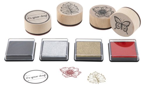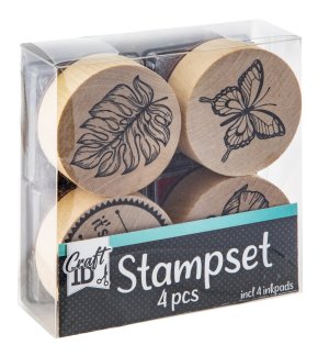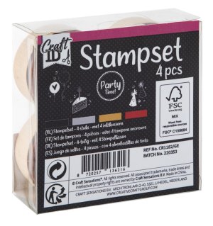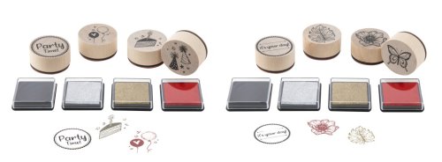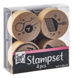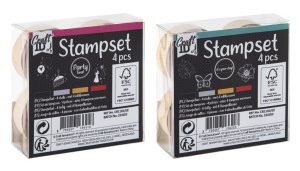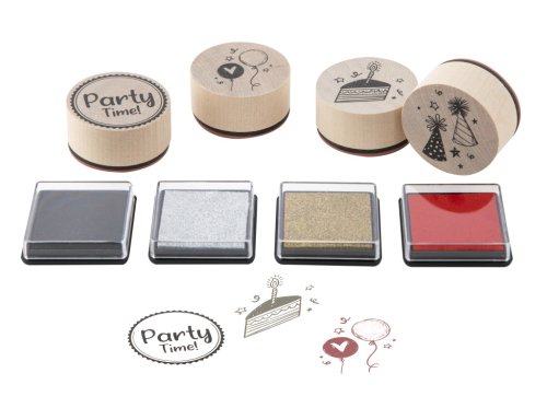 Sada 4 dřevěných razítek + polštářek – sada obsahuje 4 dřevěná razítka a inkoustový polštářek. Dva druhy razítek – párty a příroda.