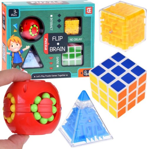 Obsah balení: Rubikova kostka, rotující hlavolam, labyrint kostka, labyrint jehlan. Upozornění : Fotografie jsou pouze ilustrativní. Barevné provedení dodáváme dle skladových zásob.