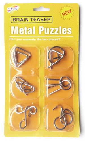 Sada šesti kovových hlavolamů v různých obtížnostech.