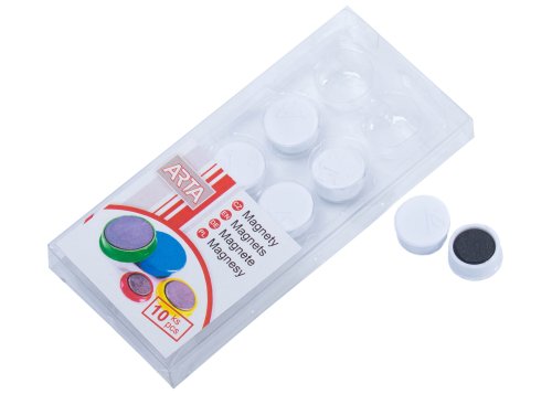 Balení silných magnetů s průměrem 16 mm. Tato sada obsahuje 10 kusů v bílé barvě. Magnety perfektně drží na každé ploše obsahující železo.