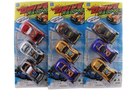 Sada plastových autíček na kartě. Mix barev - dodáváme dle skladové dostupnosti. Rozměry autíčka cca 9x3x5 cm. Rozměry balení 14x31x4 cm. Věk 3+
