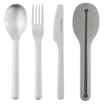 Bohatě vybavená sada nádobí pro přenos jídla sebou od značky BergHOFF. Sada obsahuje přenosnou lahev na vodu se širokým víčkem a poutkem na nošení. Díky širokému hrdlu můžete pohodlně přidat led nebo ovoce. Svačinový box o objemu 0,6 litru. Díky spolehlivému uzavření box neprotéká v žádné poloze. Vše navíc zajišťuje pružný silikonový popruh. Kompletní příbor z nerezové oceli v přenosném silikonovém obalu.