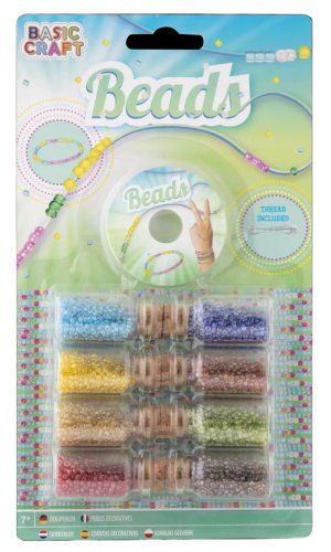 Krásná sada korálků v malých pevných lahvičkách/dózách s vrškem. Sada obsahuje 8 lahviček, v každé korálky jiné barvy – celkově tedy 8 barev korálků. Sada také obsahuje vlasec k navlékání korálků. Můžete si tak vytvořit několik náramků, řetízků nebo i prstýnků. A to nejen pro sebe, ale i pro kamarády a kamarádky.