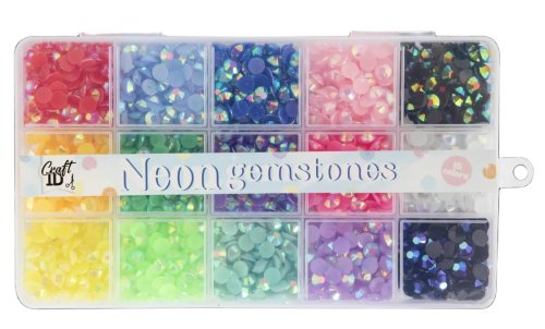 Úžasná sada obsahující 15 různých barev neonových drahokamů o průměru 6 milimetrů, dekorativní kamínky/diamanty jsou baleny v praktickém plastovém pořadači o velikosti 18x10 cm