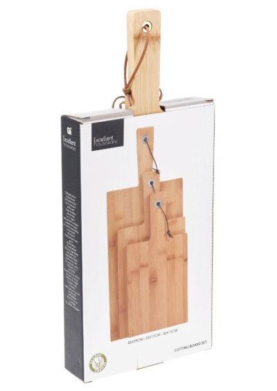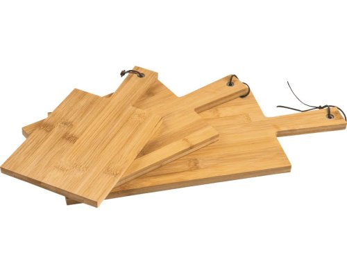 Tato sada prkének je nejen funkční, ale také esteticky příjemná. Bambusový materiál je odolný a snadno se udržuje, což z něj činí ideální volbu pro každodenní použití v kuchyni. Kovový kroužek a kožené lano dodávají prkénekům moderní a praktický vzhled.