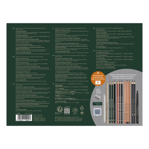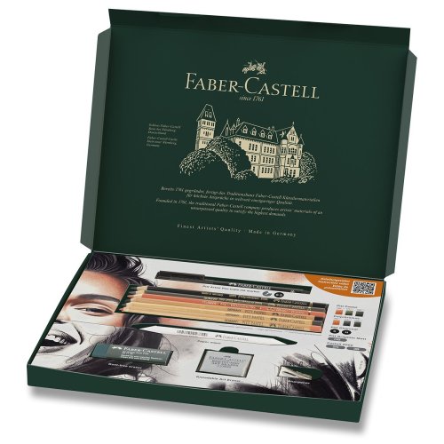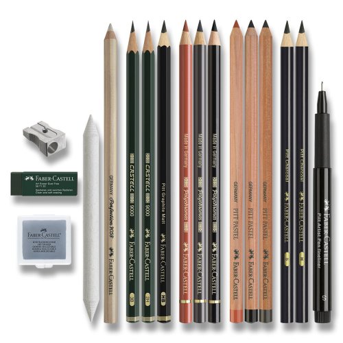 SADA OBSAHUJE:, * umělecký popisovač Pitt Artist Pen Fineliner, hrot S (0,3 mm), * 2x tužky z přírodního uhlí Pitt Charcoal (tvrdost S a H), * 3x pastelky Pitt Pastel, * 3x pastelky Polychromos, * grafitovou tužku Pitt Graphite Matt, * 2x grafitovou tužku 9000 (tvrdost 2H a 3B), * korektor Perfection, * papírovou těrku, * 2x uměleckou pryž, * ořezávátko