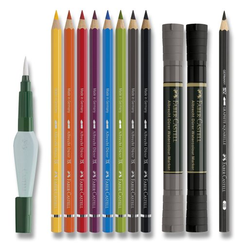 Sada obsahuje:, * akvarelovou grafitovou tužku Graphite Aquarelle (tvrdost 2B), * 2x akvarelové popisovače Albrecht Dürer, * 8x akvarelové pastelky Albrecht Dürer, * štěteček se zásobníkem na vodu