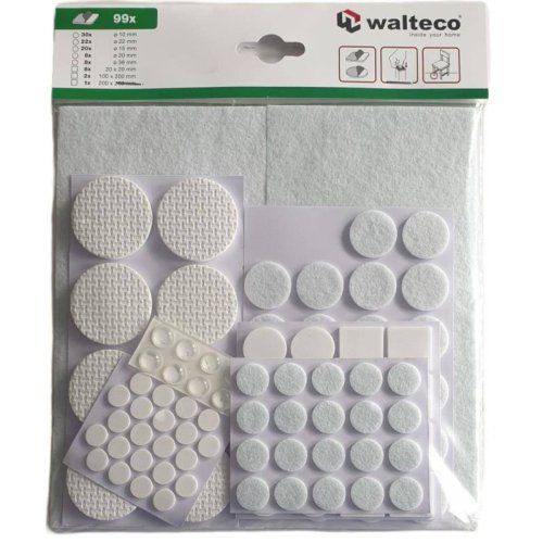 Sada obsahuje: Filcové podložky: O 22 mm - 22x, O 15 mm - 20x, 100x200 mm - 2x, 200x200 mm - 1x Podložky EVA: 20x20 mm - 8x, O 20 mm - 8x, O 10 mm - 22x, O 38 mm - 8x Tlumič dvířek: O 10 mm - 8x