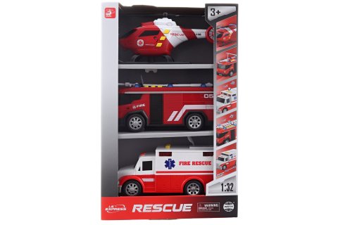 Krásná sada 3 hasičských dopravních prostředků - 2x auto + 1x helikoptéra. Každý dopravní prostředek je napájen na 3xAG13 baterie - baterie jsou součástí balení. Zvuky troubení, houkání a startování. Rozměry balení 19x30x9 cm. Velikost auta cca 15 cm. Materiál plast. Baleno v otevřené krabici. Věk 3+