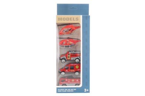 Sada hasičských kovových aut. Balení obsahuje 2 helikoptéry a 3 auta. Rozměry balení cca 10 x 27 x 3,5 cm. Věk 3+