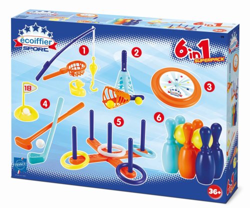 Sada 6 her vhodných do interiéru i exteriéru - frisbee, chytání rybiček, golf, chyť míček, kroužky na kříž a kuželky. Vše plastové, vyrobeno ve Francii.