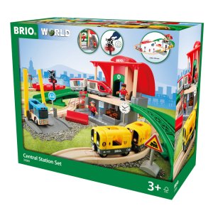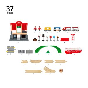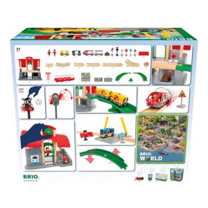 Vezměte si lístek a vydejte se na výlet s touto klasickou 24dílnou soupravou vlakového nádraží s vlaky, stanicemi a příslušenstvím. Začněte svou cestu na velké centrální stanici, kde se cestující mohou vydat nahoru výtahem nebo po schodech a dále mohou přestupovat mezi autobusovými a vlakovými linkami. Vyrobeno z evropského bukového dřeva a vysoce kvalitních plastů s precizními kovovými detaily. Rozměr cca: 144,8 x 20,3 x 69,7 cm. Rozměr balení: 45 x 39 x 21 cm. Baterie: 2x LR44 (jsou součástí balení). Počet dílků: 37. Věk: 3+