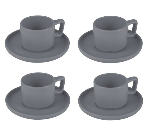 Tato sada hrnků a talířků je vyrobena z prémiové kameniny, která zajišťuje vysokou kvalitu a odolnost. Sada obsahuje 4 hrnky o objemu 100 ml (5x6,5 cm) a 4 talířky o rozměrech 12,8x1,5 cm. Matná šedá barva a matný design dodávají této sadě elegantní vzhled, který se hodí do každé kuchyně.