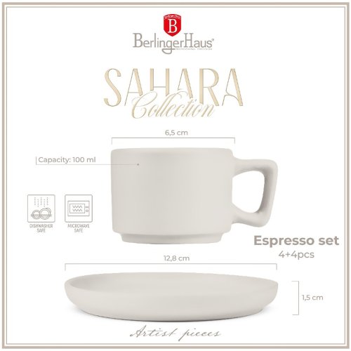 <SPAN lang=CS><P dir=ltr align=left>Vynikající kvalita kameniny<BR>Dopřejte si nadčasové kouzlo sady šálků BerlingerHaus BH-10015 Sahara. Tato sada je vyrobena z kameniny prvotřídní kvality a obsahuje čtyři šálky na espresso a čtyři odpovídající talíře, všechny v uklidňující matné krémové barvě. Šálky o rozměrech 5 x 6,5 cm a objemu 100 ml jsou ideální pro vaše každodenní espresso, zatímco talíře o rozměrech 12,8 x 1,5 cm jsou ideální jako podšálky nebo pro podávání doprovodných sušenek nebo malých pochoutek.</P><P dir=ltr align=left></P><B><P dir=ltr align=left>Jemný matný krémový povrch</B><BR>Matný krémový povrch této sady nabízí jemný, neutrální tón, který doplní jakýkoli kuchyňský dekor. Tato decentní elegance dělá ze šálků a podšálků na espresso stylový doplněk vaší kávové rutiny, ať už začínáte ráno nebo končíte večírek.</P><B><P dir=ltr align=left>Chytrý, prostorově úsporný design</B><BR>Navržený s ohledem na moderní domácnosti, set je stohovatelný pro snadné skladování, což vám umožní maximalizovat prostor ve skříni a zároveň udržet vaše pracovní desky čisté. Tato funkce je zvláště cenná v menších kuchyních nebo espresso barech, kde je prostor na prvním místě.</P><B><P dir=ltr align=left>Trvanlivost a snadná údržba</B><BR>Přirozená odolnost kameniny zajišťuje, že tato espresso sada snadno zvládne každodenní používání. Sada je vhodná do myčky i mikrovlnné trouby a nabízí kromě estetického vzhledu také praktičnost, zjednodušuje přípravu nápojů a čištění.</P><B><P dir=ltr align=left>Proč si vybrat sadu šálků BerlingerHaus BH-10015 Sahara?</B><BR>Vylepší váš zážitek z kávy svým elegantním designem a praktickými funkcemi. Ideální pro nadšence do espressa, kteří oceňují dotek stylu ve svém kuchyňském nádobí. Nabízí pohodlí v myčce a mikrovlnné troubě pro snadnou údržbu.</P><P dir=ltr align=left>Proměňte své chvíle u kávy v luxusní rituál se sadou šálků BerlingerHaus BH-10015 Sahara. Tato sada je ideální pro ty, kteří oceňují sofistikovanost a funkčnost, a zajistí, že si každé espresso vychutnáte stylově. Objednejte si nyní a posuňte svou každodenní kávovou rutinu na uměleckou formu.</P></SPAN>- Materiál: kamenina<BR>- 4 ks šálků: 56,5 cm, 100 ml<BR>- 4 ks podšálků: 12,81,5 cm<BR>- Barva: matná krémová sahara<BR>- kamenina prémiové kvality<BR>- Možnost stohování<BR>- Matný design<BR>- Lze mýt v myčce nádobí<BR>- Vhodné do mikrovlnné trouby