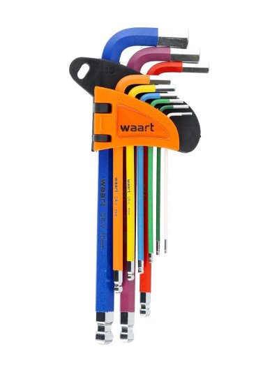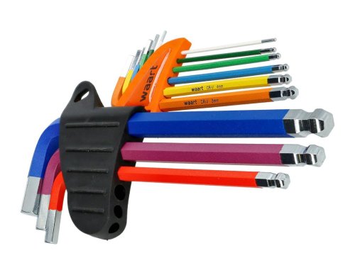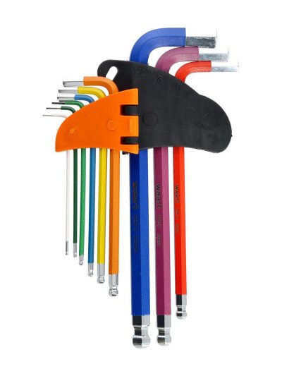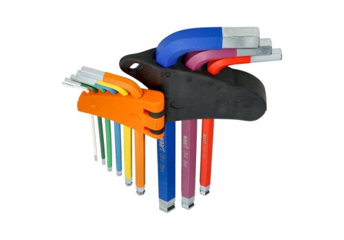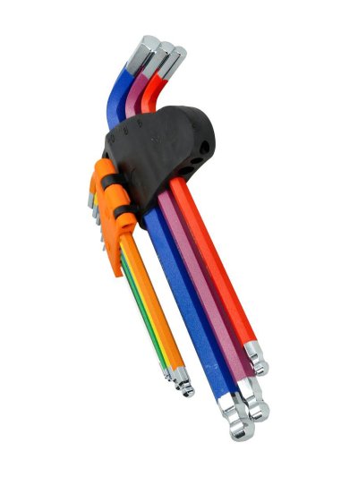 sada obsahuje 9 barevně odlišených imbusových klíčů s kuličkou: 1,5 mm - bílý 2,0 mm - tmavě zelený 2,5 mm - zelený 3,0 mm - modrý 4,0 mm - žlutý 5,0 mm - oranžový 6,0 mm - červený 7,0 mm - černý 8,0 mm - fialový 10,0 mm - tmavě modrý