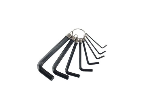Sada nejpoužívanějších rozměrů šestihranných klíčů, tvrzených v celé délce, jenž jsou zavěšené pružnými závěsy na kroužku.