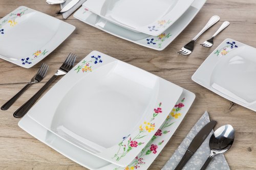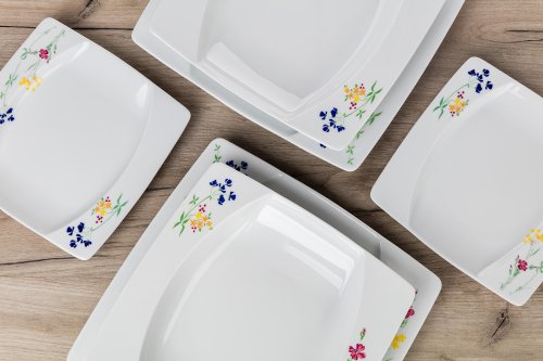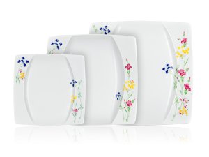 sada obsahuje: 6 x dezertní talíř 18,5 x 18,5 cm 6 x hluboký talíř 23 x 23 cm 6 x mělký talíř 27 x 27 cm