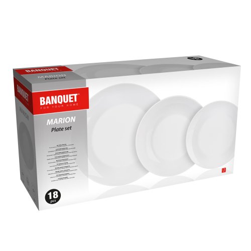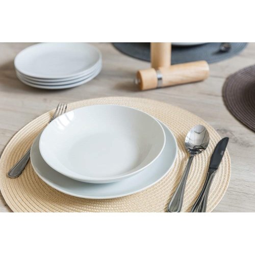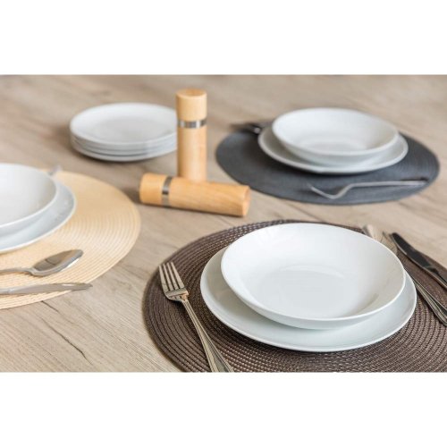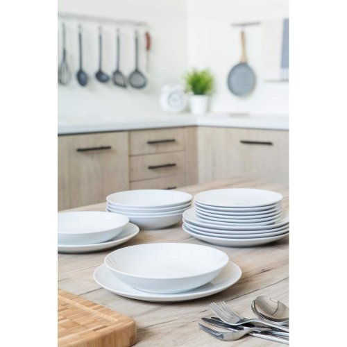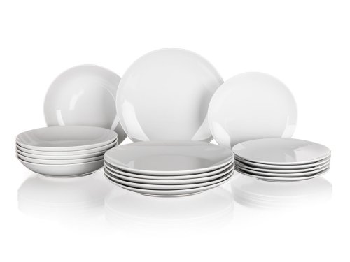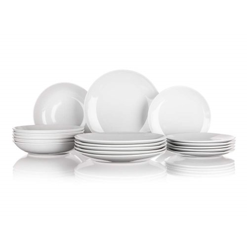 18dílná talířová sada, v bílé barvě, je vyrobena z porcelánu. Talíře lze používat do mikrovlnné trouby a mýt v myčce na nádobí.