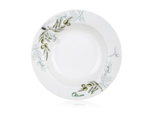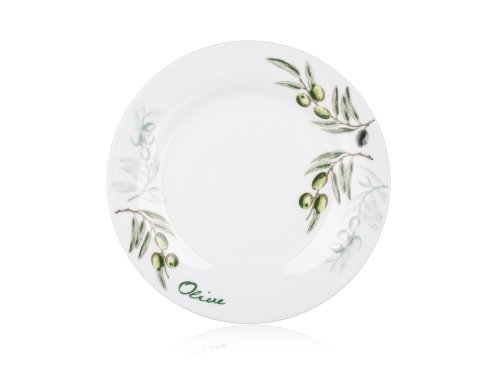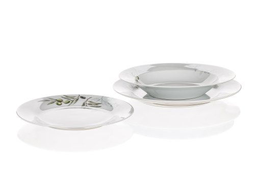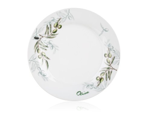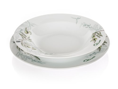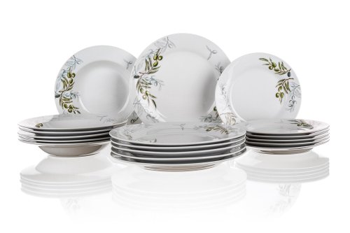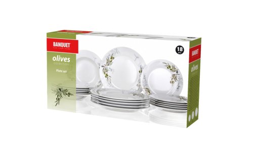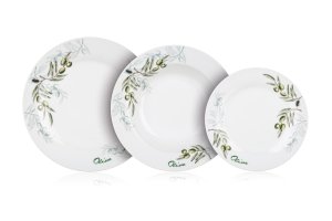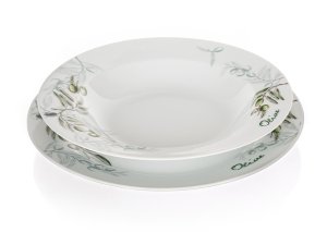 18dílná talířová sada OLIVES s dekorem olivy, je vyrobena z porcelánu. Talíře lze používat do mikrovlnné trouby a mýt v myčce na nádobí.
