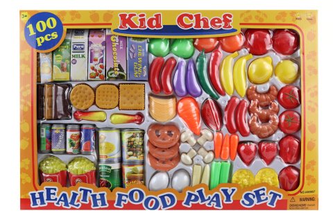Velká sada jídla . Balení obsahuje celkem 100 dílků (ovovce, zeleninu, pečivo, sladkosti, plechovky a kartonové nápoje). Rozměry balení cca 58x39x5 cm. Věk 3+