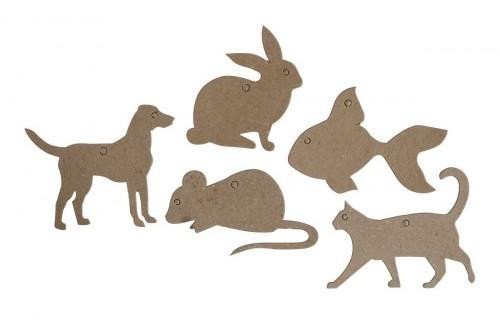 Sada lepenkových výřezů ve tvaru domácích mazlíčků. Po dozdobení můžete své výtvory zavěsit jako součást dekorace nebo přilepit na špejli a můžete se zvířátky hrát divadlo. Tvary: domácí mazlíčci - kočka, pes, králík, myš, rybička Velikost: cca 6x10 cm, tloušťka lepenky 2 mm Množství v balení: 5 ks