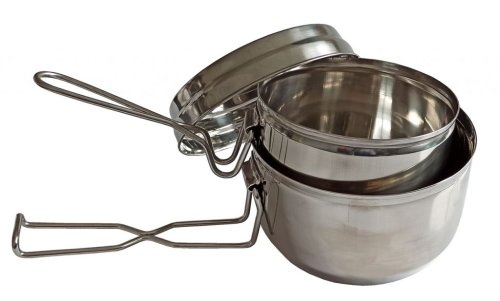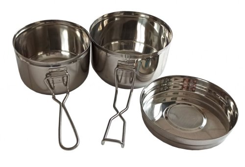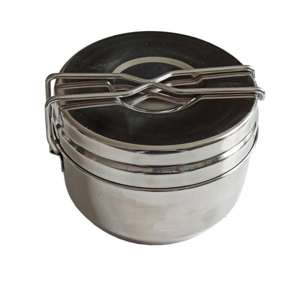 Kempingová sada nádobí - ešusy je velmi lehká třídílná sada nerezového nádobí. Základní ešus o objemu 1,4 litru (průměr 15 cm), 1 x malý ešus o objemu 1 litr (průměr 13 cm) a univerzální poklička - víčko na vaření 15 cm. Vzhledem ke své nízké hmotnosti a skladnosti je to ideální volba pro ty, kdo chtějí ušetřit co nejvíce hmotnosti. Hrnec je opatřen držákem a praktickou západkou,, která při přepravě drží víko, aby se sada nerozložila. Doporučujeme pro horolezectví a turistiku, kde je každý ušetřený gram hmotnosti vítaný.