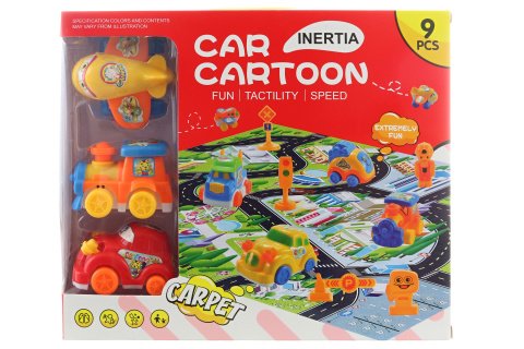 Sada koberce se silnicemi a 3 dopravních prostředků. Materiál plast. Baleno v krabici. Rozměry balení 30x25x7,5 cm. Velikost dopravního prostředku cca 8 cm. Věk 3+