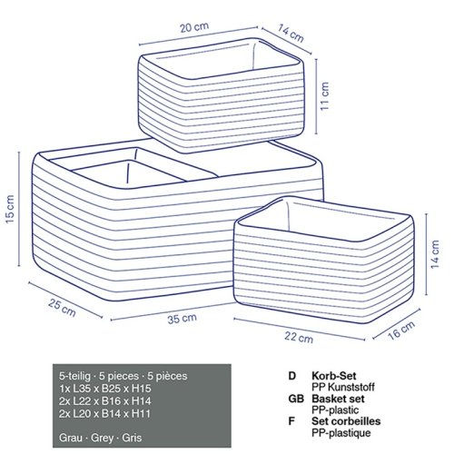 Sada obsahuje:- 2x koš 20 x 14 x 11 cm- 2x koš 22 x 16 x 14 cm- 1x koš 35 x 25 x 15 cm- materiál: PP plast- vnitřek: podšívka- barva: černá- značka: KELA